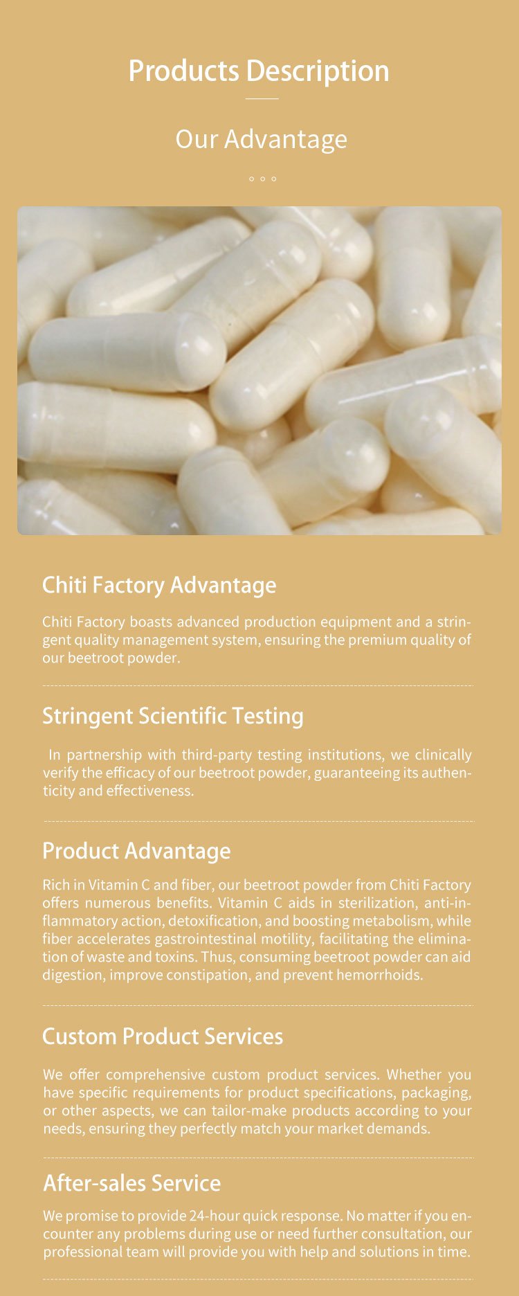 Function:Rich in Vitamin C and fiber, our beetroot powder from Chiti Factory offers numerous benefits. Vitamin C aids in sterilization, anti-inflammatory action, detoxification, and boosting metabolism, while fiber accelerates gastrointestinal motility, facilitating the elimination of waste and toxins. Thus, consuming beetroot powder can aid digestion, improve constipation, and prevent hemorrhoids.