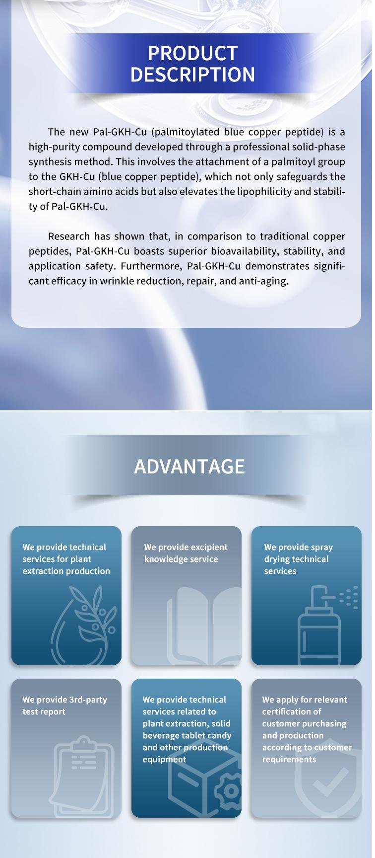 In comparison to traditional copper peptides, Pal-GKH-Cu boasts superior bioavailability, stability, and application safety. Furthermore, Pal-GKH-Cu demonstrates significant efficacy in wrinkle reduction, repair, and anti-aging.